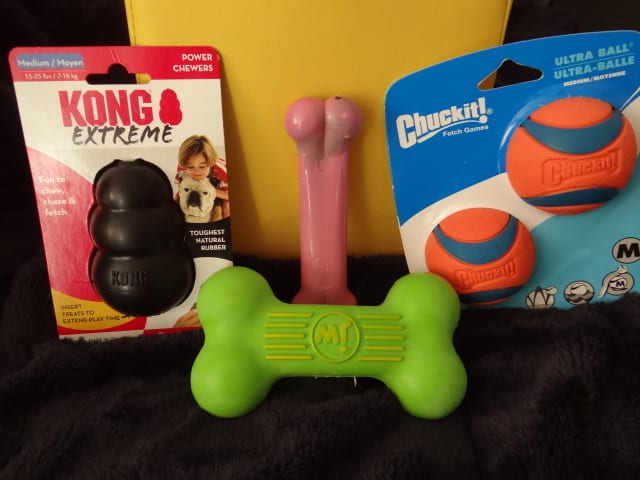 Your puppy will need hard rubber toys (like Kongs and Nylabones) and some balls. We highly recommend the rubber Chuck It balls. Usually we do not recommend soft stuffed toys at this age as the puppies will be teething.